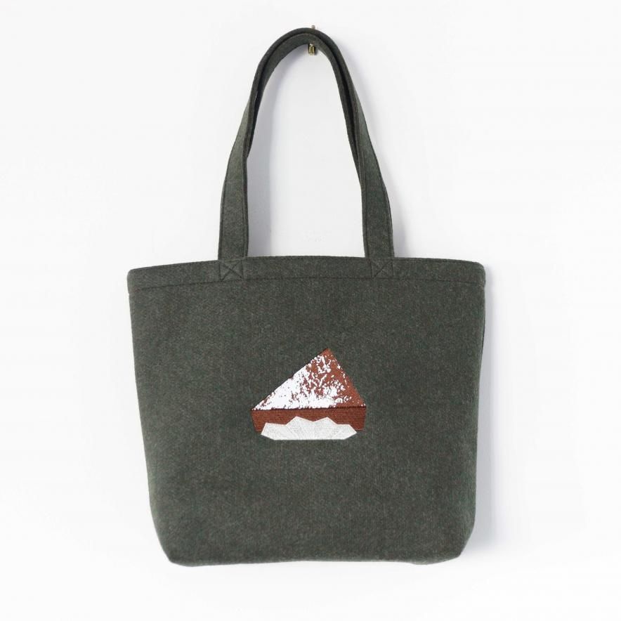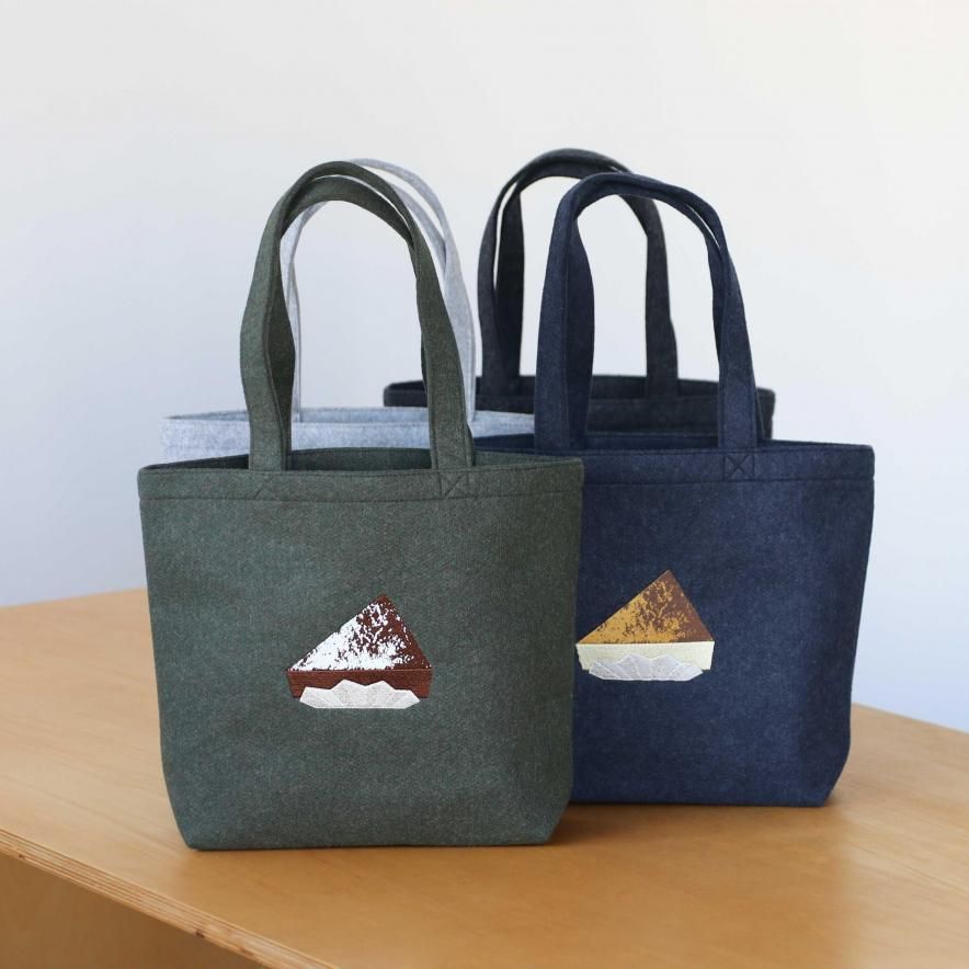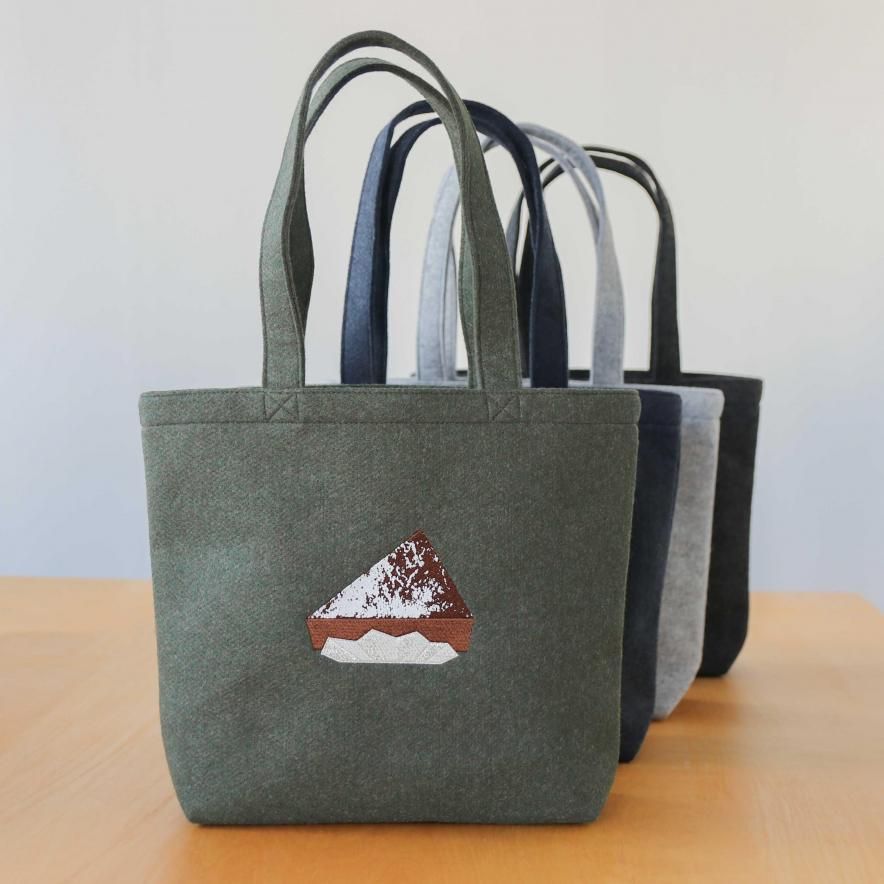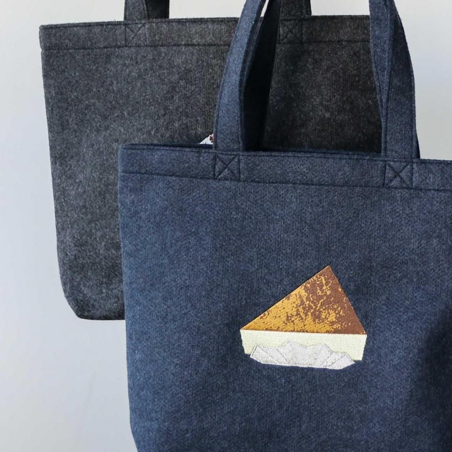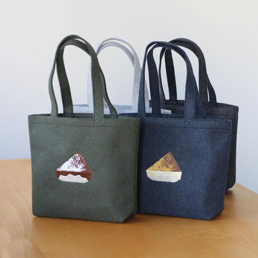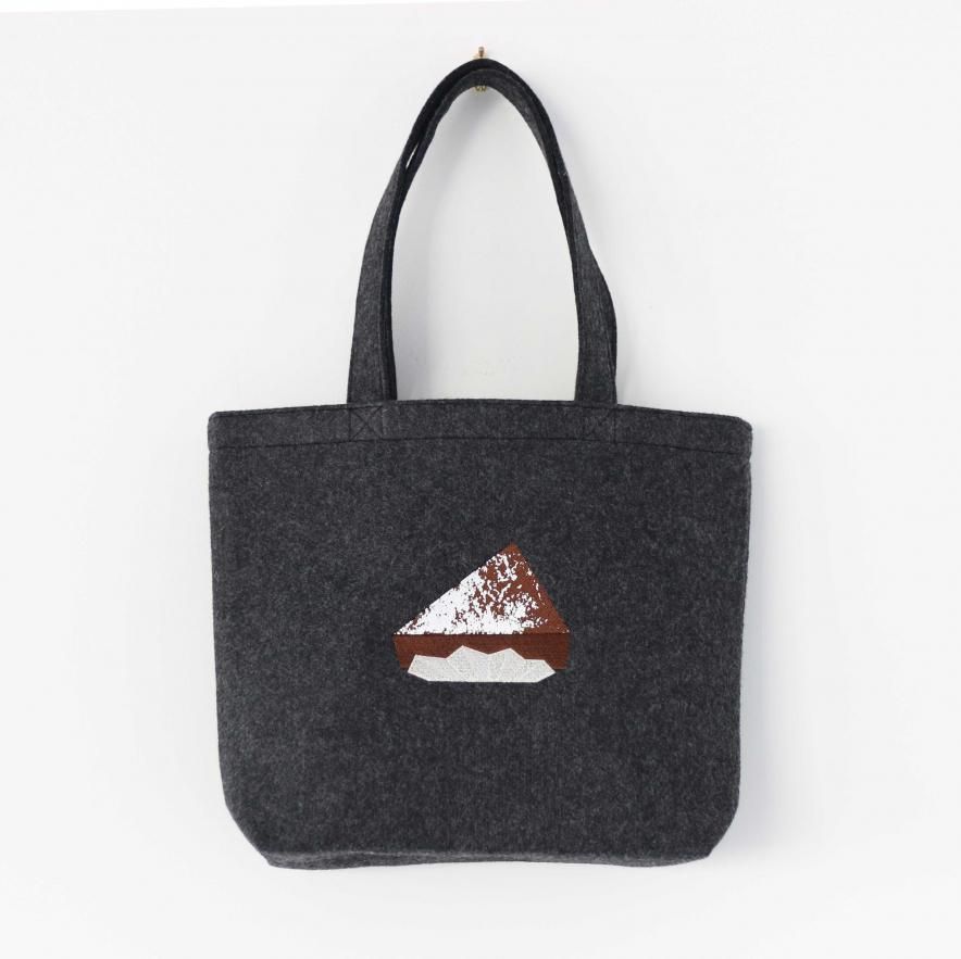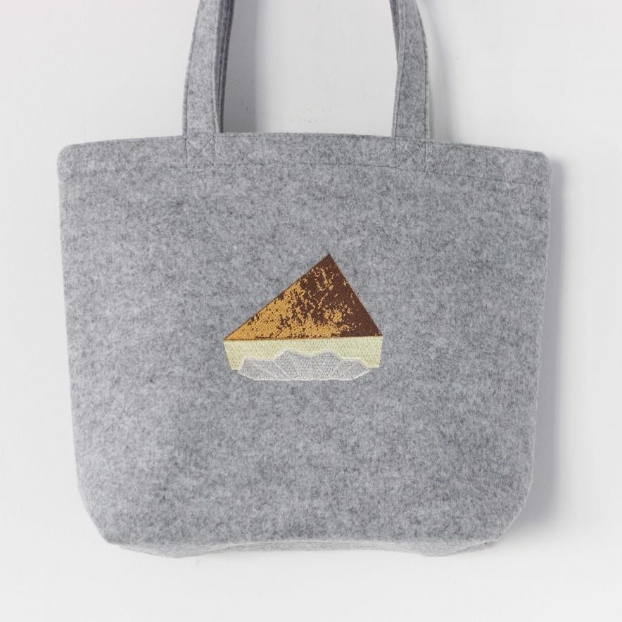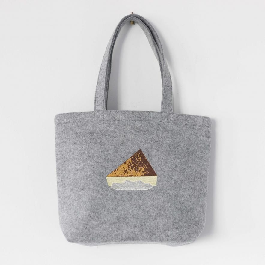 手刷りスクリーン印刷ならではのカスレの質感、凹凸を表現するインクを刺繍の上に乗せることで、緻密な糸の重なりの高級感とアナログな風合いの温かさの両方を味わえる美味しそうなケーキができました。そんなケーキが手触りの良いフェルトバッグに施されたこの商品は、日々の生活がやさしく煌めくアイテムとして販売しています。