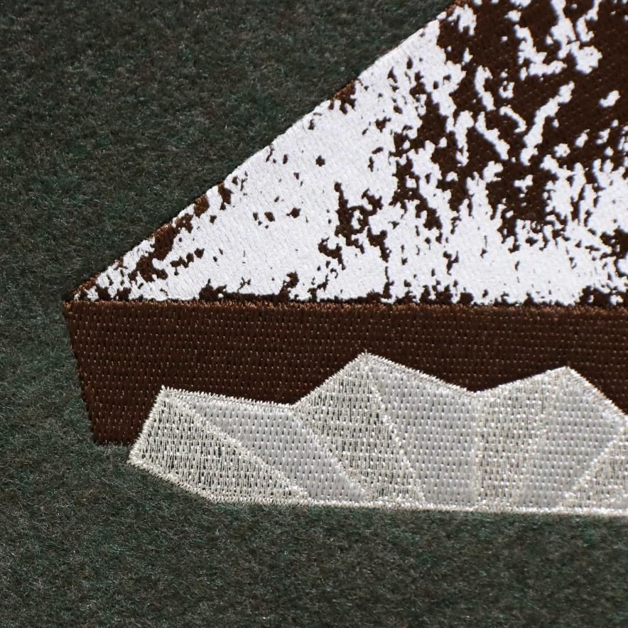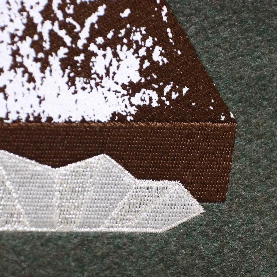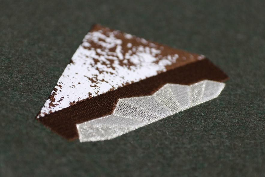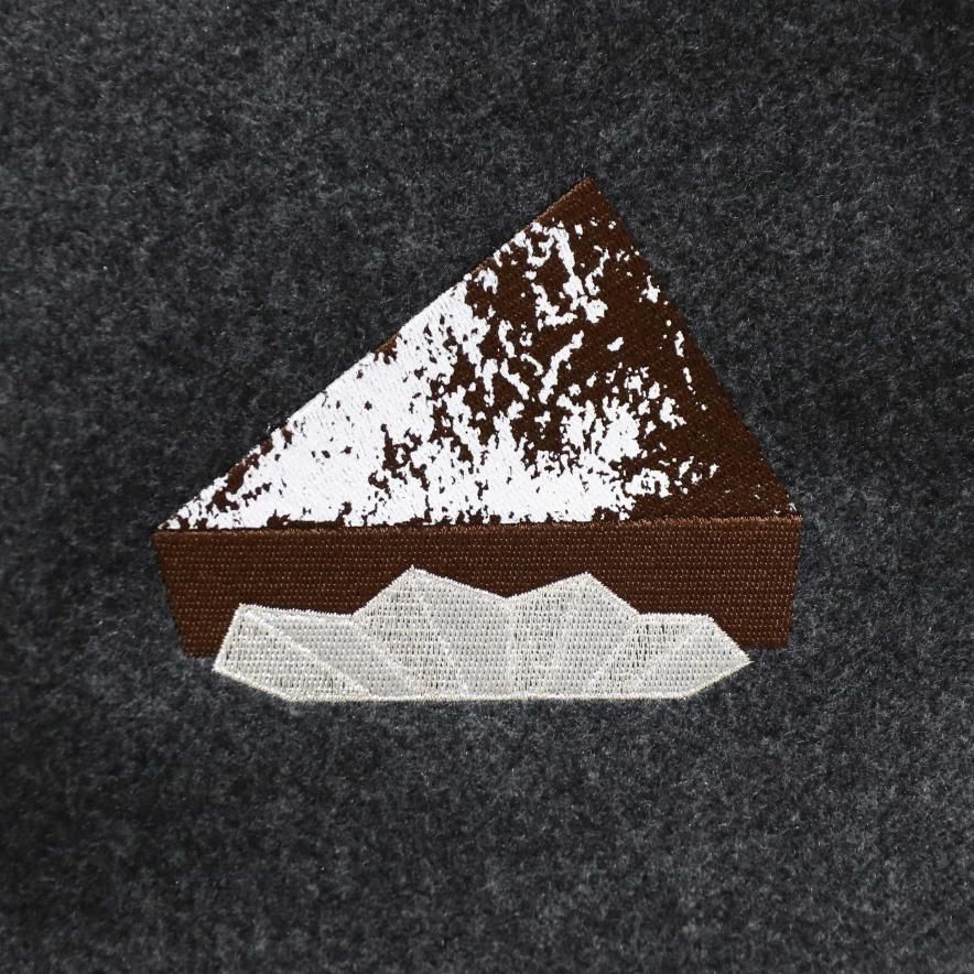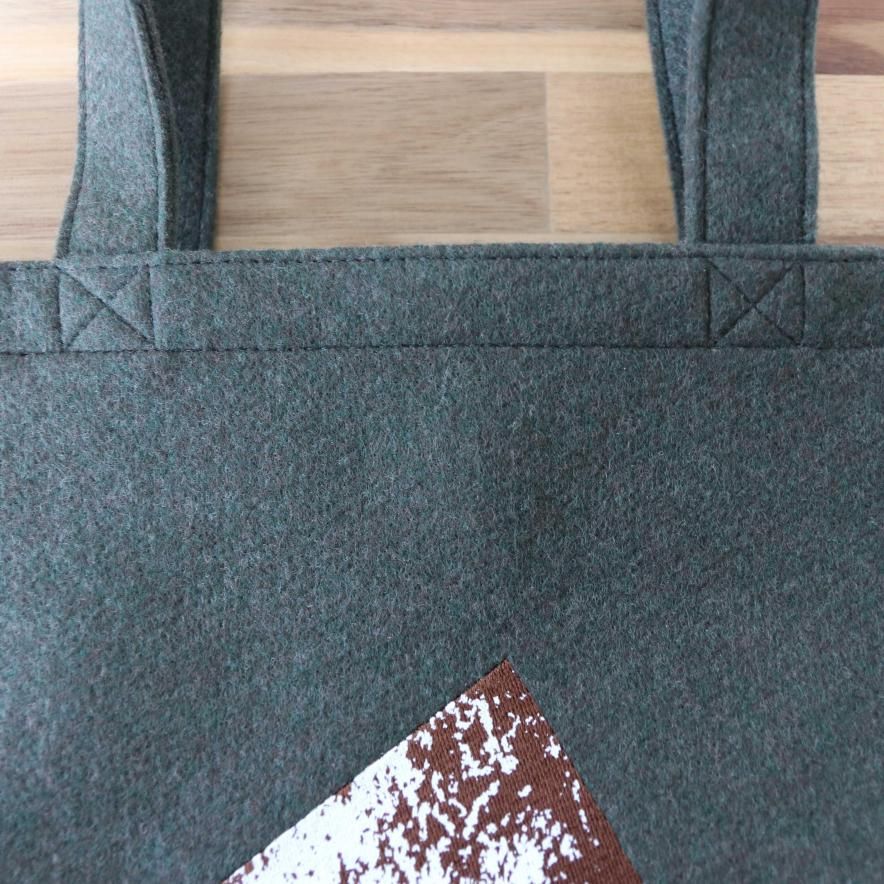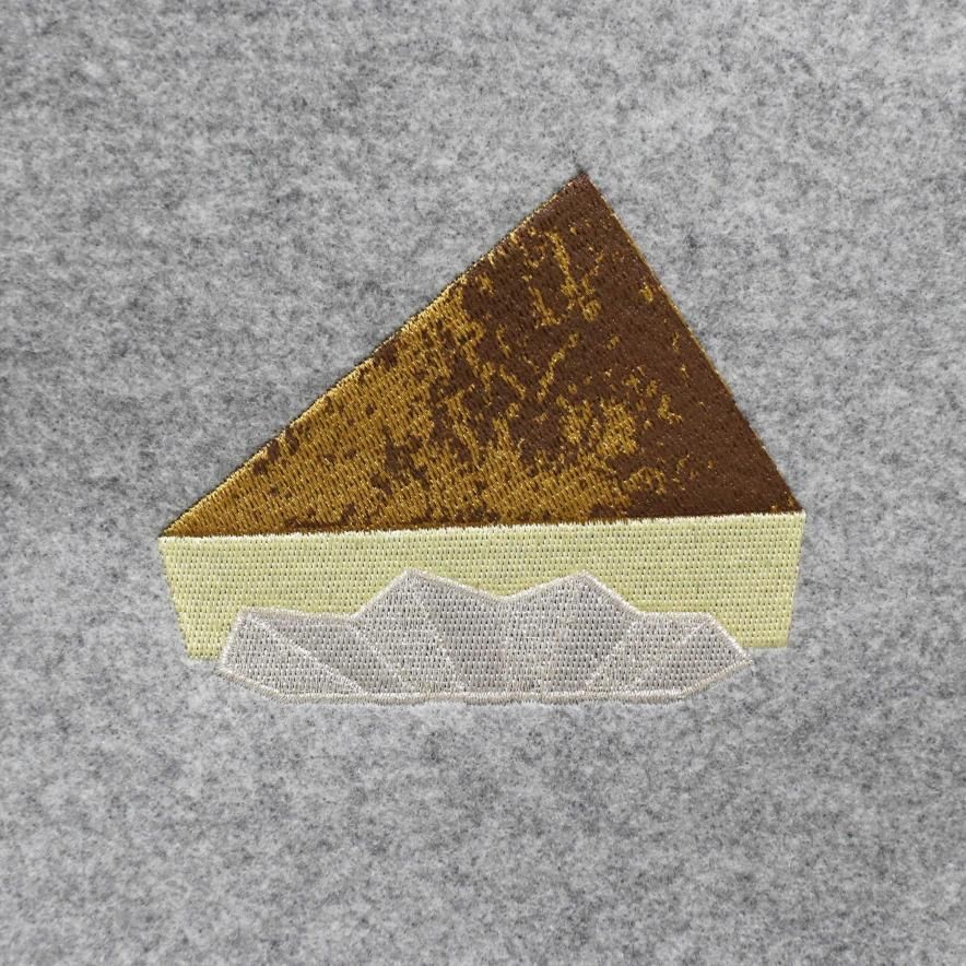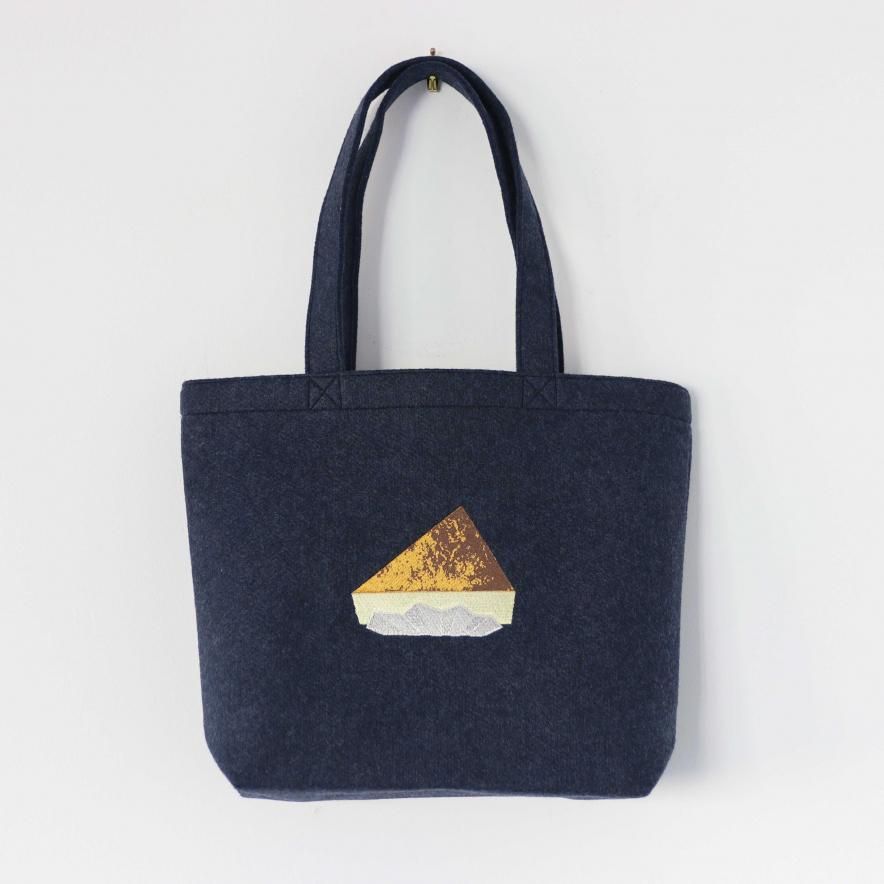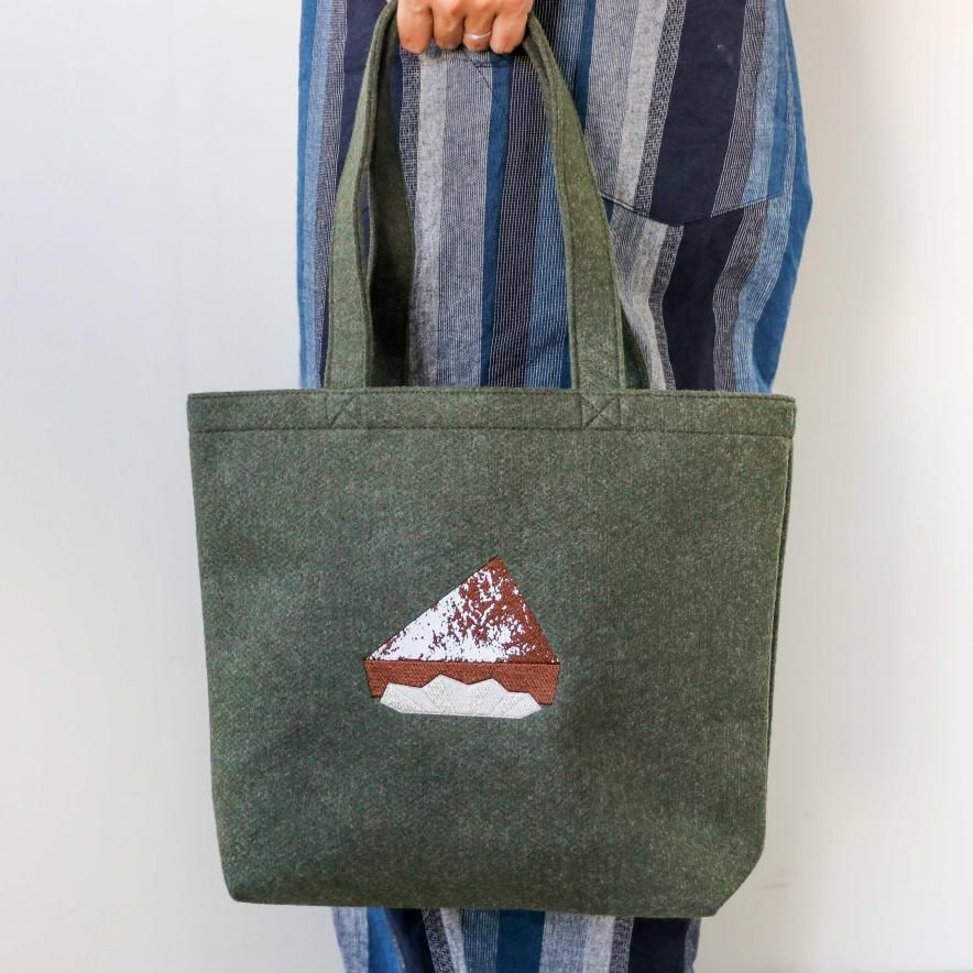 手刷りスクリーン印刷ならではのカスレの質感、凹凸を表現するインクを刺繍の上に乗せることで、緻密な糸の重なりの高級感とアナログな風合いの温かさの両方を味わえる美味しそうなケーキができました。そんなケーキが手触りの良いフェルトバッグに施されたこの商品は、日々の生活がやさしく煌めくアイテムとして販売しています。